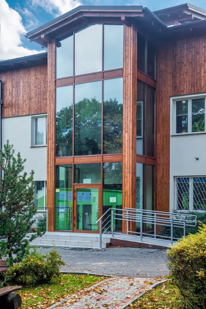 Realizacja rozbudowy i przebudowy budynku Nadleśnictwa polegała na zaprojektowaniu dodatkowej kondygnacji budynku, projekcie elewacji i aranżacji wnętrz. Budynek zyskał nowoczesny charakter poprzez zastosowanie naturalnego materiału jakim jest drewno oraz przeszkloną strefę wejściową. Charakterystycznym elementem jest taras z zielenią. Również opracowane zostały projekty wnętrz, które nabrały nowoczesnego i eleganckiego charaktery. Budynek dobrze wpisuje się w zieloną tkankę miasta.